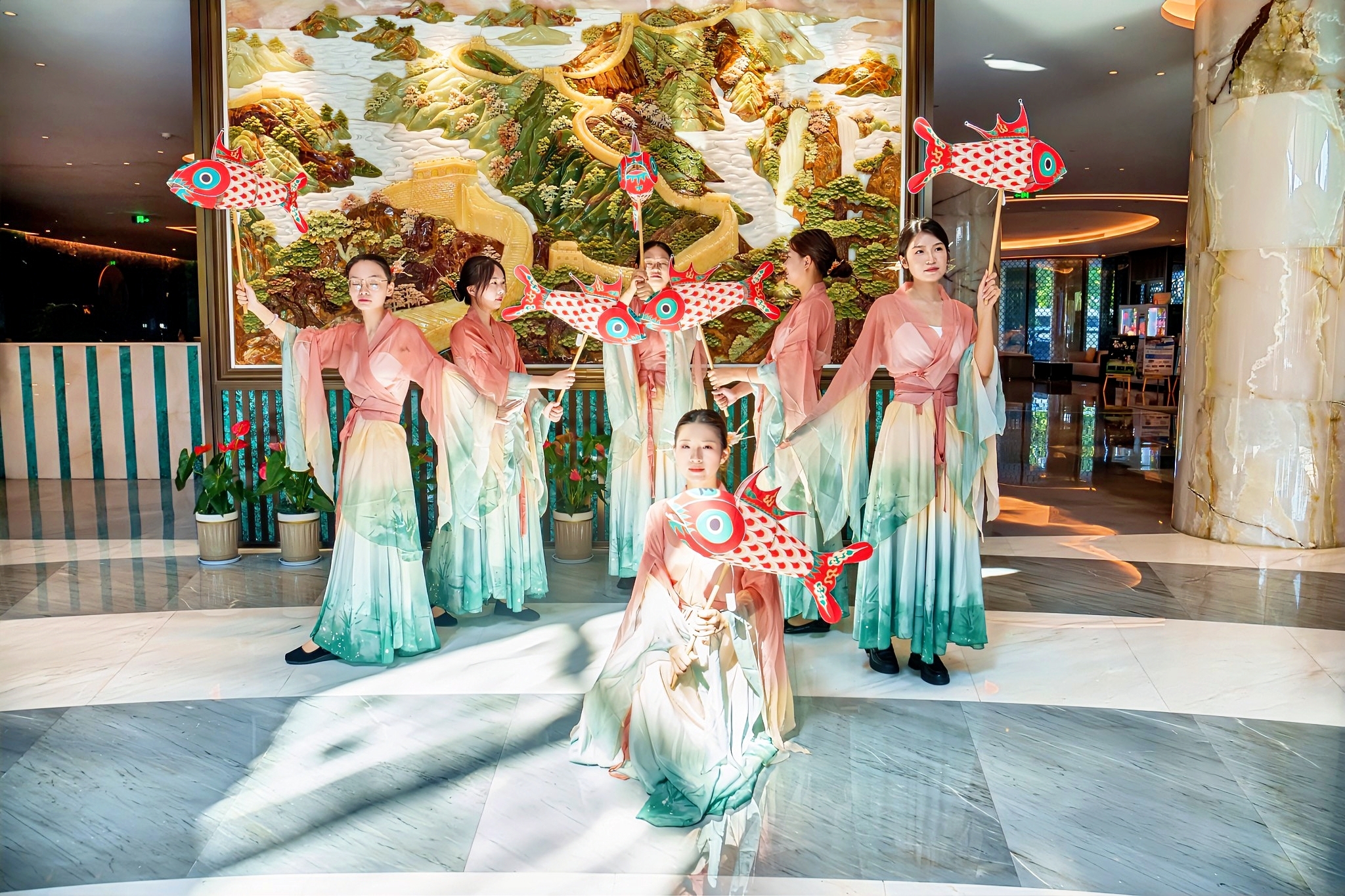 为深化福鱼文化主题内涵、升级顾客到店体验,酒店推出“鱼灯送福”主题活动。活动以酒店大堂水帘光影为特色场景,呈现非遗鱼灯漫游之态,搭配舞者足尖轻点的灵动舞姿,光影随水流摇曳,营造沉浸式视觉盛宴。活动每周六、日以及法定节假日上午 9:20 准时上演,感受福鱼文化与千岛湖风光交融的独特魅力。